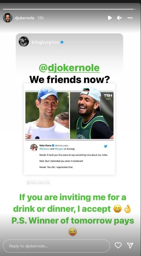 Novak Djokovic would become 'friends' with Nick Kyrgios after Wimbledon 2022 men's singles final only if the latter invited him for a drink or dinner. The Serbian was responding to an Instagram story by Kyrgios where the Australian asked, "@djokernole, we friends now?". Djokovic then responded, "If you are inviting me for a drink or dinner, I accept. P.S Winner of tomorrow pays."