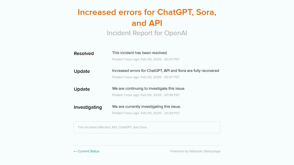 ChatGPT was down for users worldwide. According to OpenAI, users were affected by the global outage. Users worldwide faced difficulties accessing ChatGPT, OpenAI's AI chatbot. Reports indicated increased errors for ChatGPT and also for Sora and the API services. OpenAI acknowledged the issue and said, “We are currently investigating this issue.” They provided an update after a few minutes and said, "We are continuing to investigate this issue.” Later, OpenAI announced that errors for ChatGPT, API, and Sora were fully recovered, and the incident has been resolved. Sam Altman, OpenAI CEO, Discusses AI Roadmap With Indian Startup Founders and Investors During India Visit.