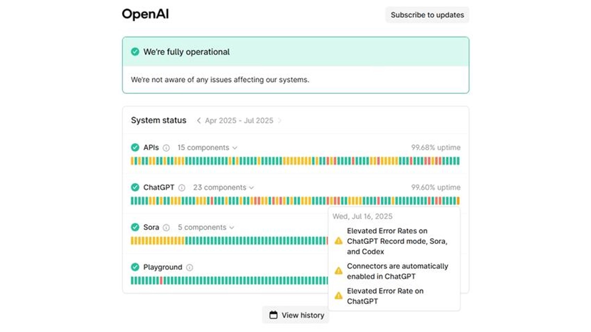 Is ChatGPT down for some of its users? ChatGPT and other OpenAI services like Sora reportedly faced a major outage on July 16, 2025. As per Downdetector, the ChatGPT outage report started at around 6:10 AM IST and peaked at around 7:52 AM IST. Several ChatGPT users took to X (formerly Twitter) to share their experiences on alleged ChatGPT disruption. One user posted, “Is ChatGPT down right now or am I the only one seeing this response to any prompt I give it?” Another user wrote, “When ChatGPT is down and now you have to solve your own problem.” The OpenAI status page also acknowledged the issue, showing “elevated error rates on ChatGPT record mode, Sora and Codex.” Grok Major Improvement Coming: Elon Musk Hints xAI Team Working on V7 Foundational Model With Much Better Image and Video Understanding, Hints at Next ‘Grok 4.20’ AI Model.
