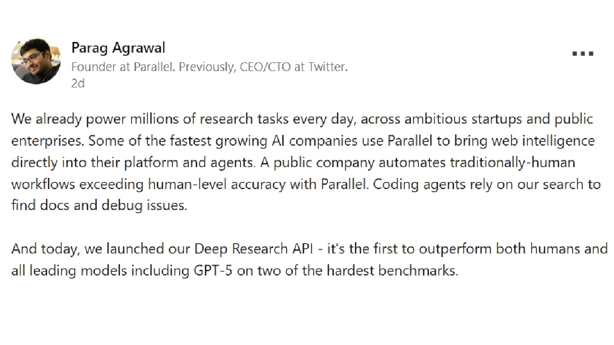 Parag Agrawal's Parallel Web Systems Launches 'Deep Research API'; Check Official LinkedIn Post