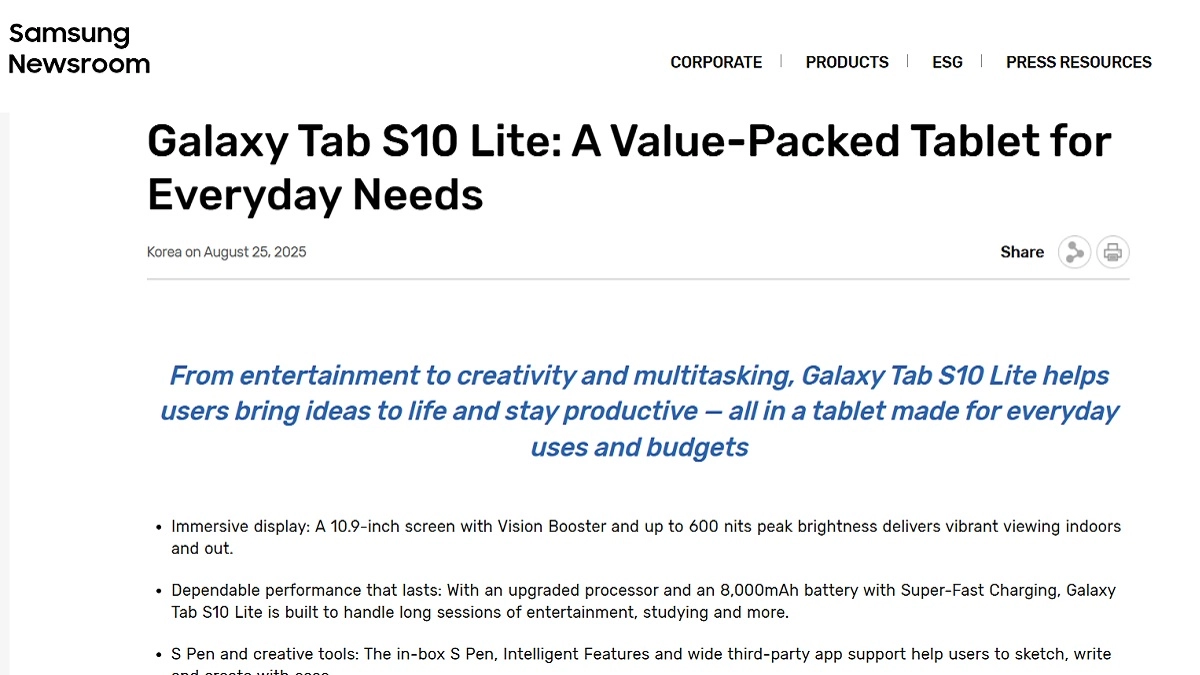 Samsung Galaxy Tab S10 Lite Specs and Features Revealed