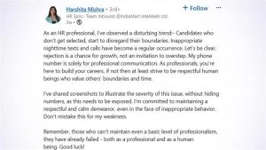 Harshita Mishra, HR Spoc- Team Inbound at IndiaMart InteMesh Ltd., shared a post on LinkedIn and addressed an allegedly disturbing trend in the hiring process. She noted an increase in unprofessional behaviour from candidates after rejections and highlighted the disrespect of personal boundaries through inappropriate late-night calls and texts. Mishra said, “Rejection is a chance for growth, not an invitation to overstep.” Mishra aimed to bring awareness to maintain professional respect and boundaries. She further said, “As professionals, you're here to build your careers, if not then at least strive to be respectful human beings who value others' boundaries and time.” In her post, Mishra also shared screenshots to highlight the seriousness of the behaviour of a candidate who was allegedly rejected after a job interview. Latest Government Jobs Notifications: IIT Hyderabad Invites Applications for 31 Non-Teaching Posts, Know Recruitment Process, Eligibility and Steps to Apply.
