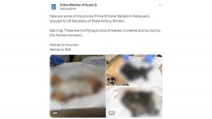The office of the Prime Minister of Israel Thursday, October 12, shared on social media some horrifying pictures of the babies killed in an attack by Hamas militants. The photos were also shown to US Secretary of State Antony Blinken by Israel PM Benjamin Netanyahu during his visit. The photos included the body of an infant who was killed in the ghastly attack. The Prime Minister’s office claimed that the photos were of babies murdered and burnt by Hamas. "Hamas is inhuman. Hamas is ISIS," the Israeli PM's office posted on X, formerly Twitter. 'Hamas Is Worse Than ISIS': Israel PM Benjamin Netanyahu Shares Heart-Wrenching Photo of Blood-Laden Baby Bed Amid Reports Hamas Militants Beheaded Babies.