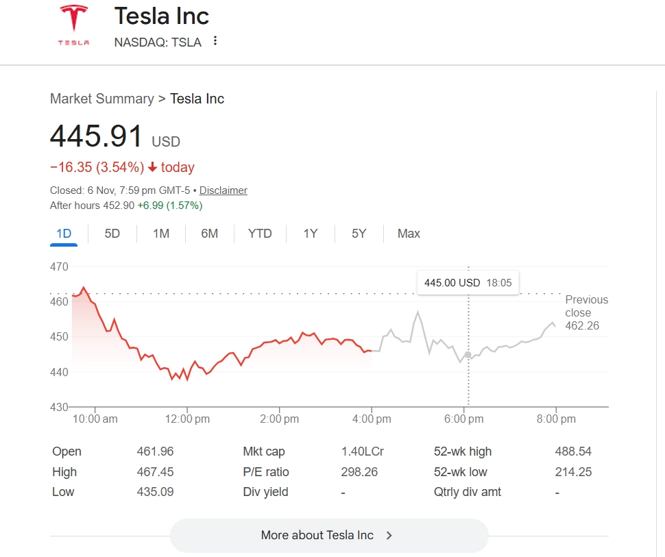Tesla Inc (NASDAQ: TSLA) shares fell 3.54% to USD 445.91 on Thursday, even as shareholders overwhelmingly approved CEO Elon Musk’s massive pay package, valued at up to USD 1 trillion. The compensation plan, designed to secure Musk’s leadership as Tesla pushes deeper into AI and robotics, won over 75% support at the company’s annual meeting. Despite the vote of confidence, investors showed caution, with the stock rebounding 1.57% after hours to USD 452.90, reflecting mixed sentiment over the ambitious deal and its long-term impact on Tesla’s financial outlook. Elon Musk Edges Closer to Become World’s First Trillionaire As Tesla Shareholders Approve Record Pay Deal.