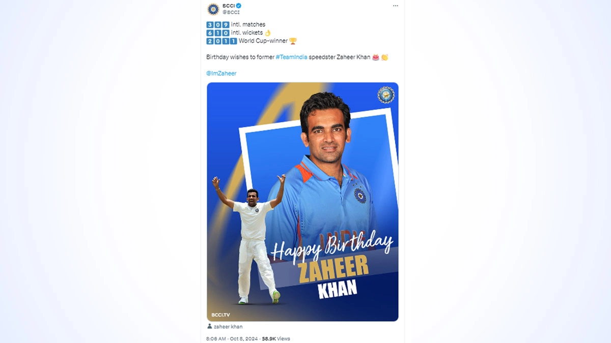 Fans shared some reactions on social media after the Board of Control for Cricket in India (BCCI) wished Zaheer Khan on his birthday, but a day later. The ex-India national cricket team fast bowler, as per several reports, celebrated his 45th birthday on October 7 and several fans were taken aback when the Indian cricket board shared birthday wishes for him on October 8 instead. Wishes poured in for him as he turned 46 a day ago. Former cricketer and Zaheer Khan's teammate Yuvraj Singh also had shared a hilarious wish for the latter on his birthday on October 7. Lucknow Super Giants, the franchise he joined as mentor not very long ago, also wished him on October 7. Yuvraj Singh Shares Unique Wish for ‘Cookie Monster’ on His Birthday, Writes ‘ Hope You Aren’t Stealing Someone’s Cookies’ (See Post).