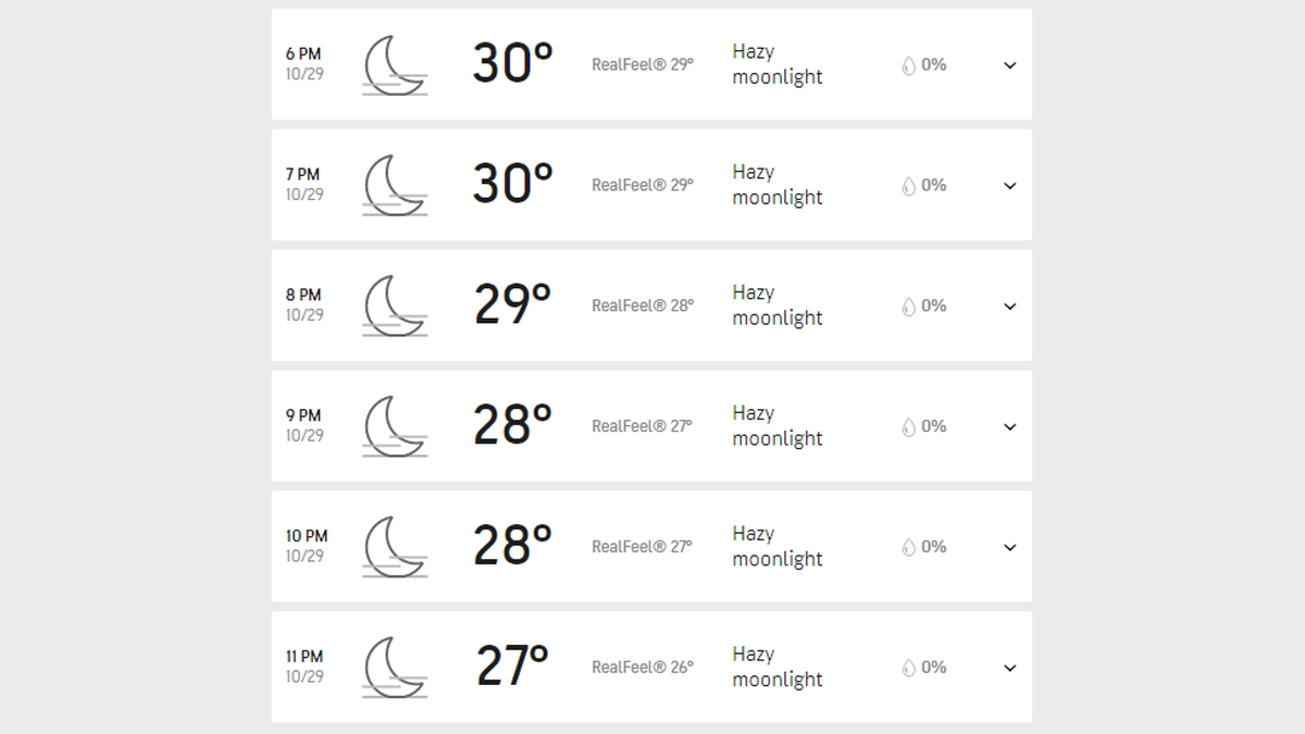 The temperature at Dubai will be around 30 degree Celsius on October 29, 2020, as per accuweather.com. The humidity will be around 45 per cent and the wind will blow at a speed of 15 km/h. The cloud is clear and there is no chances of rain.