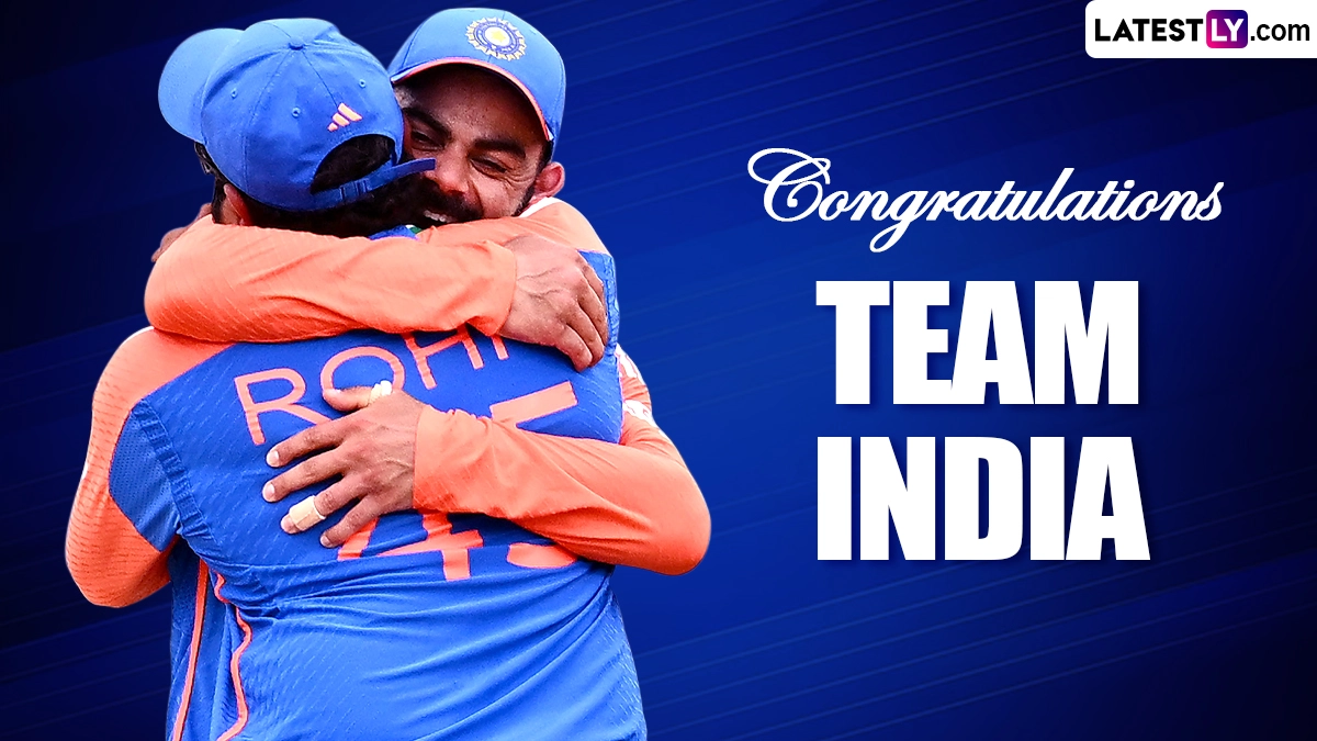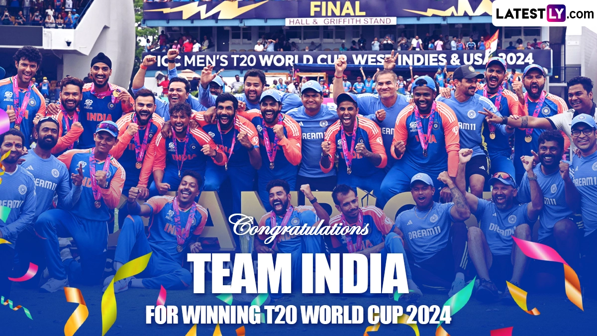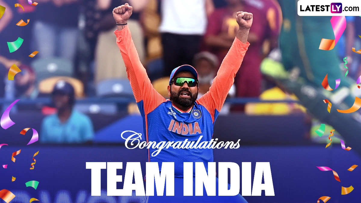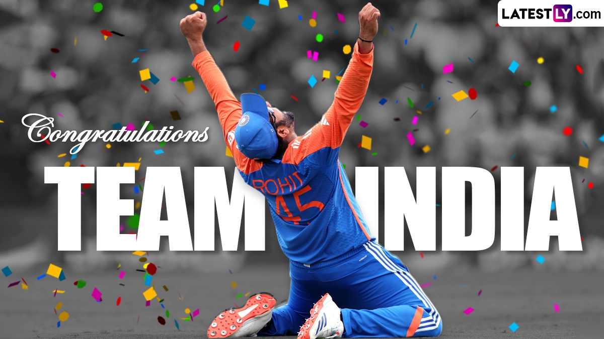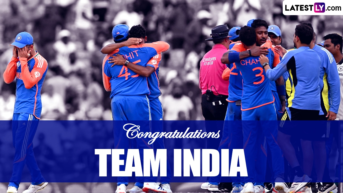 Indian Cricket Team Photo 2024: India won the ICC T20 World Cup 2024 title with a seven-run win over South Africa in what was a highly entertaining final in Barbados. The match swung like a pendulum and India eventually overcame South Africa by just seven runs to win their second T20 World Cup title and first ICC title after a wait of 11 years. Emotional scenes followed at the Kensington Oval in Barbados after India's win. On the other hand, South Africa's wait for a maiden ICC title was a so-close-yet-so-far moment for the Proteas after Heinrich Klaasen had brought them close. After the highly-exciting India vs South Africa final, we bring to you messages of congratulations for Team India along with HD Images which fans can share on WhatsApp status. Fans also have the option of downloading these images for free on Facebook and Instagram stories.ย Rohit Sharma Slaps Ground in Joy After India Beat South Africa To Win ICC T20 World Cup 2024 Title in Barbados, Video Goes Viral.