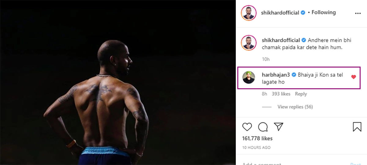 While fans showered praises in the comment section, Harbhajan Singh posted a hilarious comment. âBhaiya ji Kon sa tel lagate ho (What kind of oil do you use?â the Chennai Super Kings wrote. However, Dhawan didnât take long in responding as he replied by saying: âshuru sarso toh kitaa c tey hun olive oil paaji (Started from mustard but using olive oil now).â Have a look.