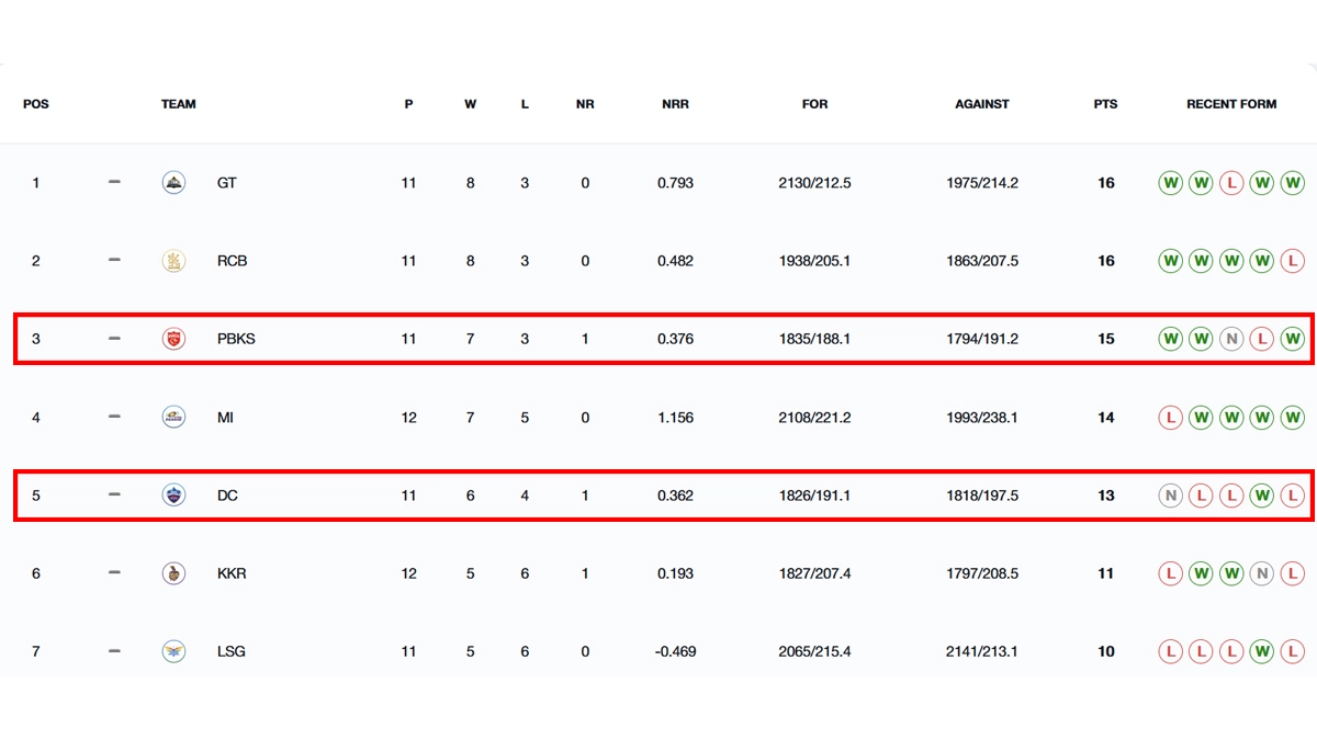 Punjab Kings remained third with 15 points from 11 matches, while Delhi Capitals stayed in the fifth spot, having scored 13 points in the same number of games. There is a possibility that the PBKS vs DC IPL 2025 match will be replayed at a later time and hence, both teams have not been given one point each from the game.
