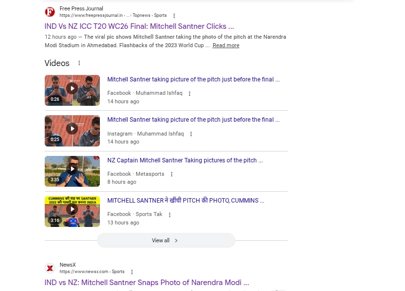 A photograph of New Zealand captain Mitchell Santner inspecting and photographing the pitch at the Narendra Modi Stadium is going viral. The image surfaced just 24 hours before tonight’s T20 World Cup 2026 final between India and New Zealand. It appeared to intentionally mimic a famous 2023 photograph of Australian captain Pat Cummins performing an identical action, a moment that remains a sensitive memory for Indian supporters following their defeat in that year's ODI World Cup final at the same venue. India vs New Zealand Prediction: Who Will Win IND vs NZ T20 World Cup 2026 Final Match?