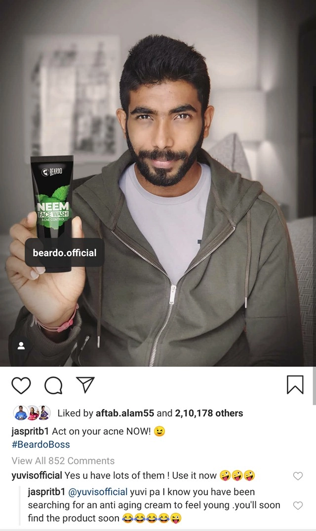 So here’s what happened. Jasprit Bumrah posted a snap of himself promoting the Beardo product. The caption of the snap read, “Act on your acne now #BeardoBoss.” Yuvi who obviously follows Jasprit Bumrah trolled him hilariously and commented, “Yes u have lots of them! Use it now.” Bumrah had a savage response up his sleeve and emphasized how Yuvi hunts for an anti-ageing cream. Check out their banter below: