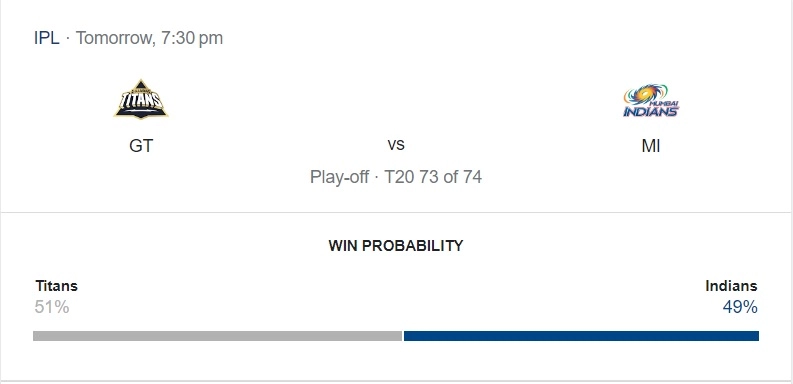 As per Googleās Win Percentage, the Gujarat Titans side are the favourites to win the contest with 51 % win probability. The prediction is justified considering the form and performance Gujarat have shown earlier. Throughout the tournament, Gujarat have shown why they deserve to be the number one ranked IPL side. Ā The prediction further states that Mumbai have got 49% chance of winning the match, stating that the upcoming match might be a close affair. It is a close prediction and considering the depth of both teams, we can expect the contest to be a close encounter.