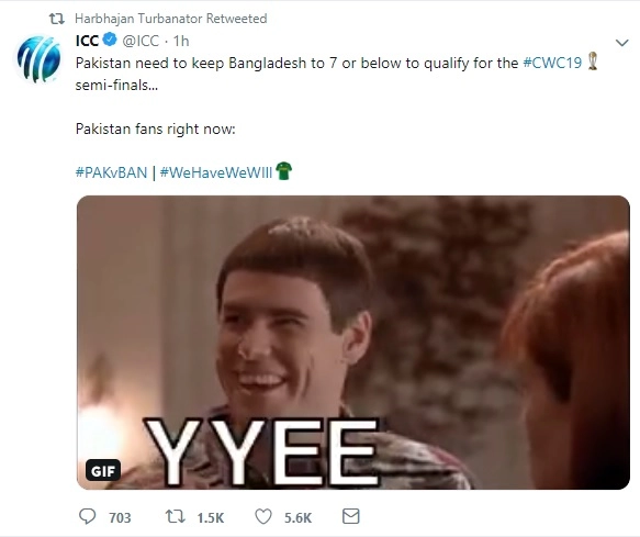 The International Cricket Council has been on a trolling spree. A while ago they trolled Pakistani fans after Imam-Ul-Haq and Mohammad Hafeez got dismissed. Now once again after Pakistan posted a total of 315 runs, they had to bowl out Bangladesh for the score of seven in order to secure a place in the semi-finals of CWC 2019. With this, once again the International Cricket Council put out a post where they once again trolled Pakistani fans. This time it was Harbhajan Singh who joined the bandwagon and trolled the Men in Green fans further. Pakistan vs Bangladesh Cricket Score 43th ODI Match.