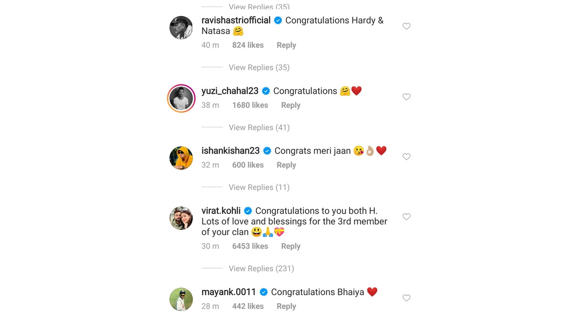 Pandya’s Indian colleague were quick to congratulate the all-rounder as they bombarded the post with comments. ‘Congratulations to you both H. Lots of love and blessings for the 3rd member of your clan’ wrote Indian skipper Virat Kohli. While coach Ravi Shastri wrote ‘Congratulations Hardy & Natasa.’