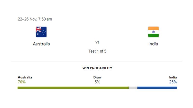 While India were blanked 0-3 at home by New Zealand, Australia had triumphed against the Black Caps earlier this year in what was their last Test appearance prior to the Border-Gavaskar Trophy 2024-25. However, Australia were held to a 1-1 draw by West Indies in their last Test series at home. It is also important to know that the Google Win Probability is likely to change as well during the course of the game.