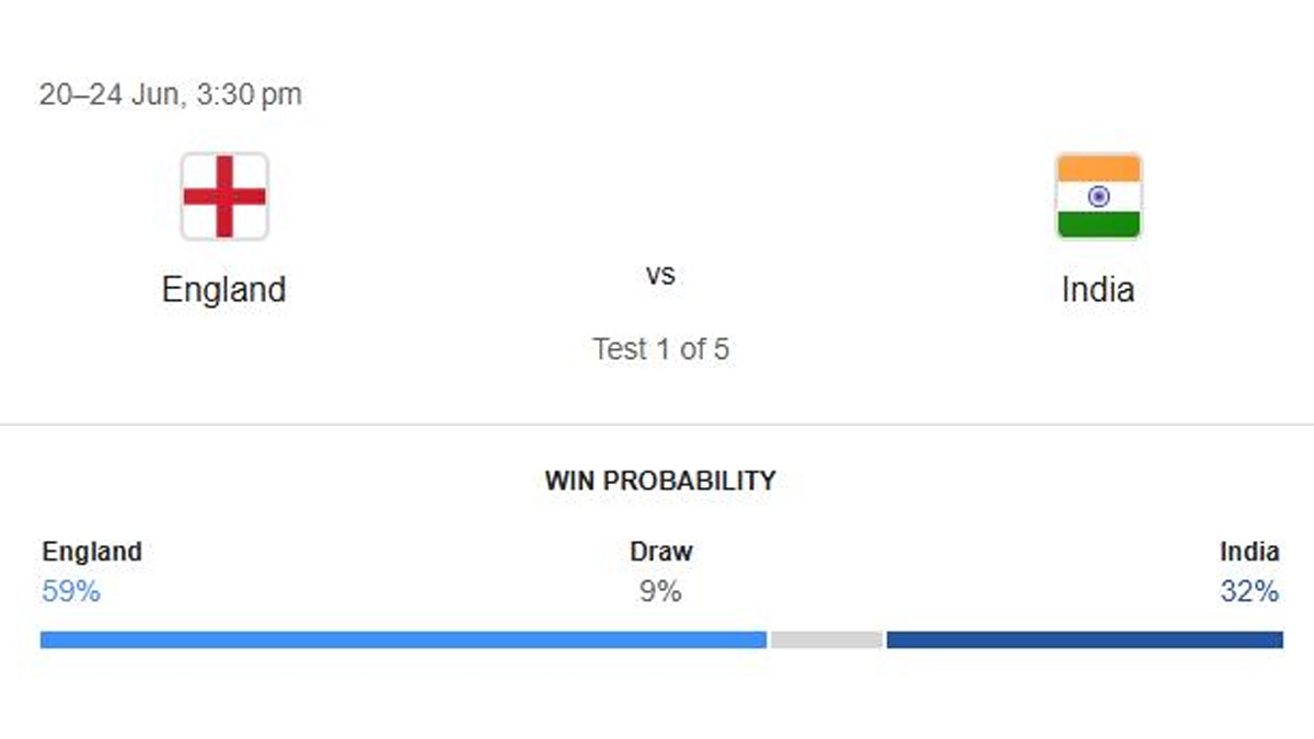 As per Google Win Probability, England have a greater chance at securing victory in the IND vs ENG 1st Test 2025 as compared to that of India's. Ben Stokes and his men have a 59% chance of winning the IND vs ENG 1st Test 2025 with India's chances being 32%. Recent Test form might play a role in this and also the fact that England are playing in home conditions might have led to the Google Win probability tilted in England's favour. The chances of the IND vs ENG 1st Test 2025 finishing in a draw are 9%.
