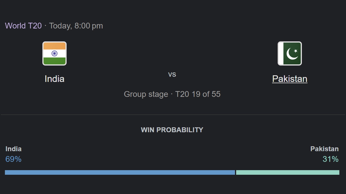 India vs Pakistan is not just a great rivalry in cricket but also in the world sport and as per Google's win probability ratio Men in Blue will be able to grab the win over Pakistan. Google has indicated Pakistan's win probability as 31% and India has win probability of 69%. It will be a match of high intensity as the fans will also turn up in the stadium in huge numbers and it will surely be a house-full contest.