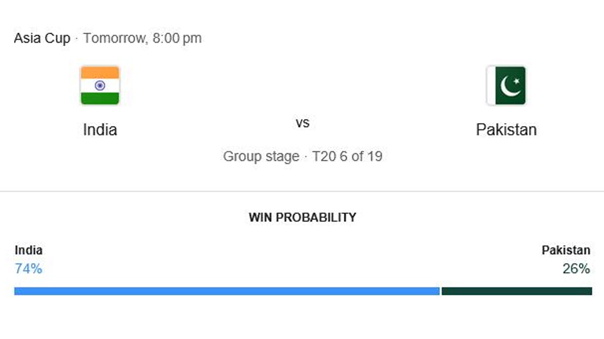 India vs Pakistan contests are always exciting to watch and the current form of both teams shows that this one would be no different. As per Google's Win Probability, India are favourites to beat Pakistan in their blockbuster Group A Asia Cup 2025 match. This could be as a result of the dominance India showed in their first match of Asia Cup 2025 against the UAE. As per Google's Win Probability, India have a 74% chance of winning the IND vs PAK Asia Cup 2025 match as compared to Pakistan, who have just 26% to their name. However, one important thing to note here is that the Google Win Probability will change during the course of the IND vs PAK Asia Cup 2025 match.