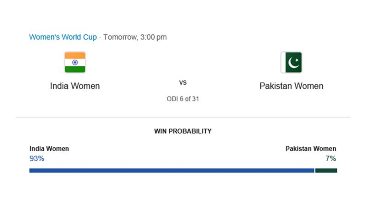 Google's India vs Pakistan result prediction above is pretty clear and it does not need any explanation. On expected lines, the India Women's National Cricket Team are heavy favourites to beat the Pakistan Women's National Cricket Team at the ICC Women's World Cup 2025. India have a 93% chance of winning the IND-W vs PAK-W ICC Women's World Cup 2025 match in Colombo as compared to Pakistan's 7% and this perhaps is based on the recent form of these two teams and also the head-to-head record. âMauka Maukaâ Makes A Comeback Ahead of IND vs PAK ICC Womenâs World Cup 2025 Match But With Asia Cup and âOperationâ Twist (Watch Video).