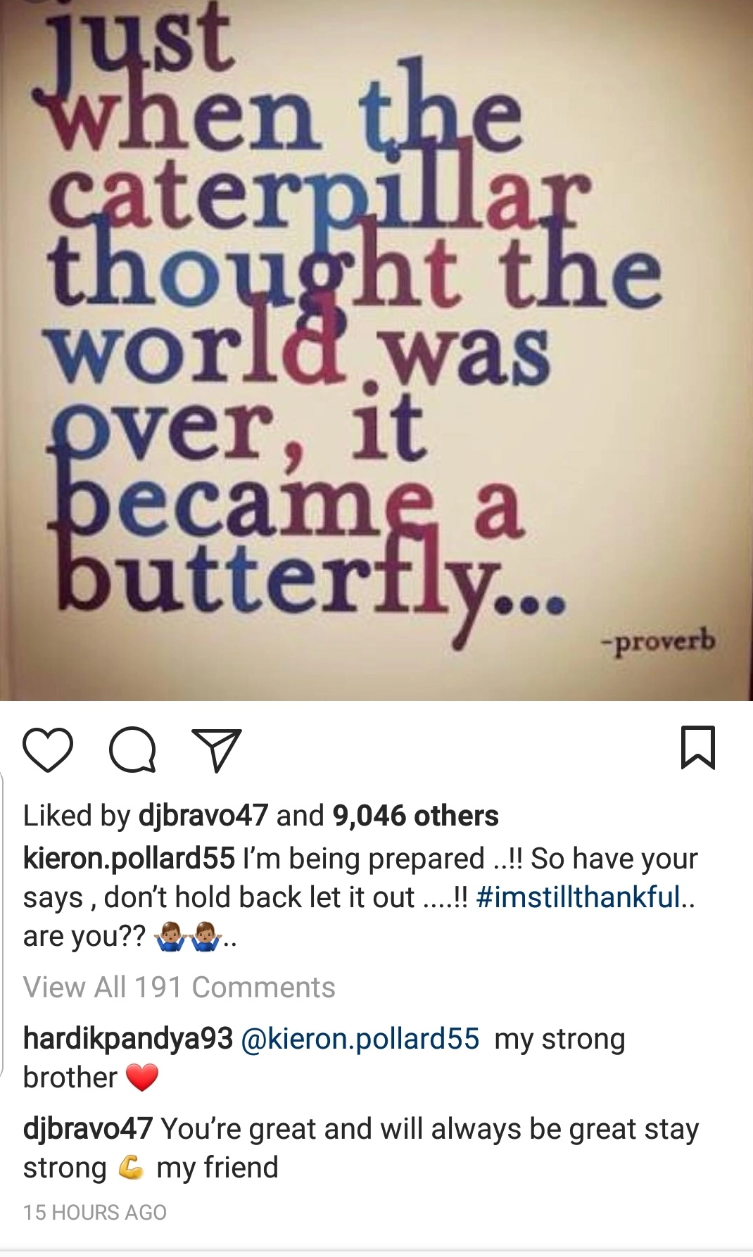 The all-rounder too was disappointed with his performance thus Kieron Pollard put up a post with a quote which read, “Just when the caterpillar thought the world was over, it became a butterfly.” Hardik Pandya obviously read the post and wrote, “kerion.pollard55 my strong brother.” Dwayne Bravo, who represents CSK had a few words for Pollard. He wrote, “You’re great and will always be great stay strong my friend.”