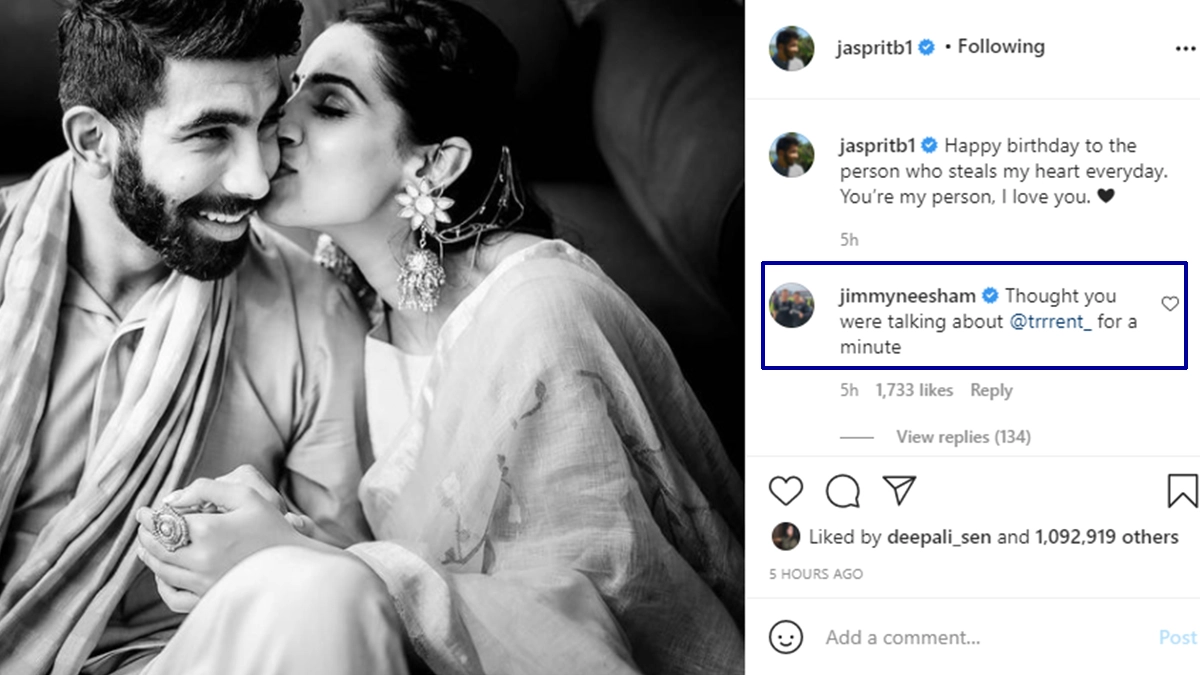 Mumbai Indians pacer Jasprit Bumrah took to social media and shared an adorable picture with his wife Sanjana Ganesan on her birthday. Sanjana, who tied knots with the Indian speedster earlier this year, turned 29 on Thursday (May 7). On the occasion, Bumrah extended greetings to his better half with a romantic post. "Happy birthday to the person who steals my heart everyday. You're my person, I love you," the fast bowler wrote while posting a loveable picture with the TV presenter. While the comment section got flooded with heart-warming messages, Bumah’s MI teammate Jimmy Neesham took the opportunity to tease the talismanic bowler. Happy Birthday, Sanjana Ganesan! Fun & Panache, Jasprit Bumrah’s Sweetheart Wife Is Ruling the Fashion Game and How (See Pics).
