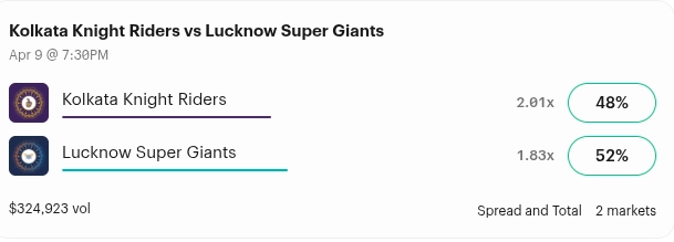 Data from the prediction market Kalshi indicates a neck-and-neck battle, with the Lucknow Super Giants holding a marginal statistical edge over the home team. The market, which has seen significant trading volume, currently reflects the following probabilities: