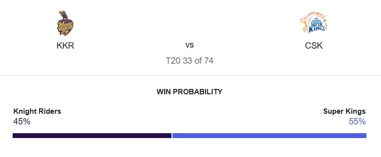 So, what has Google predicted for theĀ high voltageĀ KKR vs CSK IPL 2023 match.Ā In an expectedĀ prediction, as per Google Win Probability, Chennai Super Kings are favourites to win the clash. Google's Win Probability has given Ā Chennai Super Kings 55% chance to win the much-anticipated cricket match. Apparently, as per Googleās predictionĀ Kolkata Knight RidersĀ has 45% chance of winning the game.