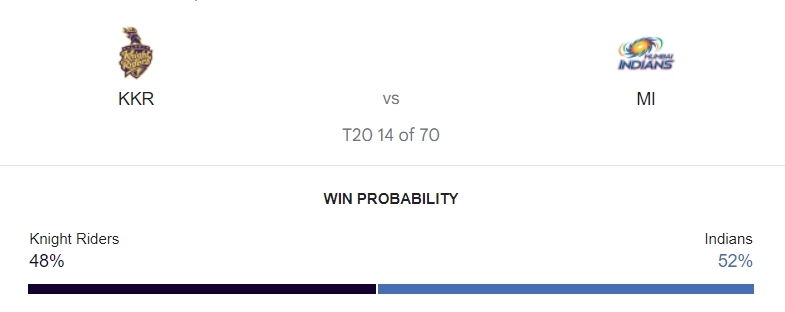 According to Google predictions, Mumbai Indians have an edge over Kolkata Knight Riders. The odds are slightly in favour of Mumbai at 52% with KKR's odds being 48%.