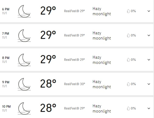 Since this is the second match, the weather is expected to be a bit cooler. There would be The game will start with the temperatures being below 30 degrees Celcius. The weather will be constant for three more hours and then will dip by a degree. The mercury will remain at 28 degrees Celcius at 9.00 pm IST. The moonlight will be hazy of course there would be no rains to bother the game. Now, let's have a look at the snapshot of the weather below: