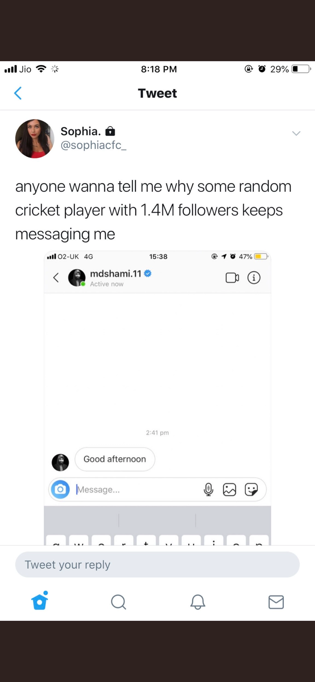 Shami’s message to Sophia read ‘good afternoon’. The screenshot was shared on Twitter by a profile named @sophiacfc_ Along with the screenshot, the tweet read, “anyone wanna tell me why some random cricket players with 1.4M followers keeps messaging me.”