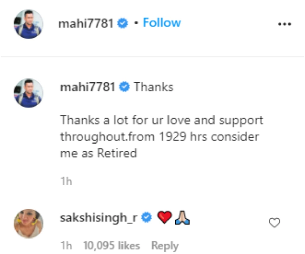 MS Dhoni left an entire national speechless after announcing his international retirement with immediate effect. Dhoni announced his decision through an Instagram post. In the Instagram post, Dhoni shared a four-minute-long video of his moments with the Indian cricket team. The wonderfully captured moments of his time while donning the blue jersey. From his run-out in his debut match to the heartbreaking moment at the 2007 ODI World Cup to his iconic picture of celebrating the T20I World Cup, the video had a snapshot of each moment of the 39-year-old. Dhoni’s wife Sakshi also took to social media to react on Dhoni’s retirement. MS Dhoni, Suresh Raina Announce International Retirement: 5 Heart-Winning Pictures of CSK and Team India Legends Together.
