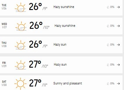 First, we shall have a look at how the weather will behave in the next five days. So the weather in Karachi will be mostly constant. For the first three days, we shall have hazy sunshine. For the first three days, the temperature will be around 26 degree Celcius on a higher side. On the lower side, the temperature will be around eight degree. Rains will not be interfering the match and the fans can enjoy the full game. Now, let's have a look at the snapshot of the weather below: