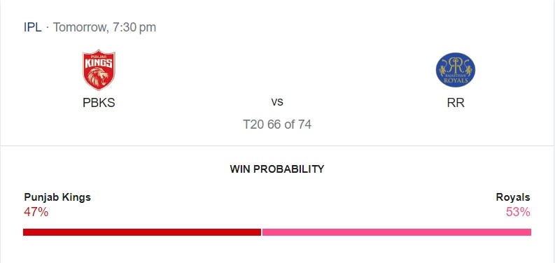 As per Googleâs Win Percentage, the Rajasthan Royal side are the favourites with 53% winning chance and it is also justified, given their form and performance they have put in earlier this season. Â The prediction further states that Punjab have got 47% chance of winning the match, stating that the upcoming match might be a close affair. It is a close prediction and considering the depth of both teams, we can expect the contest to be a close encounter. However, there is also a possibility that Punjab may also pull off a win against Rajasthan, provided if they put up their best performance.