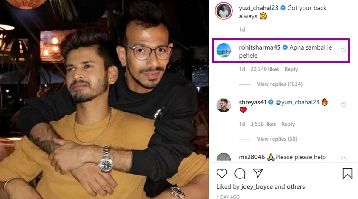 Rohit Sharma is currently injured and has not taken part in the ODI series against New Zealand but the opener is making waves on social media as he was involved in a funny banter with team-mate Yuzvendra Chahal. It all started after the leg spinner posted a photo with Shreyas Iyer on his Instagram account. ‘Got your back always’ Chalal captained his post. But Rohit Sharma was quick to shut down the bromance between the two as he trolled the leg-spinner with a witty comment on his post. Yuzvendra Chahal Trolls Virat Kohli and KL Rahul, Says How Two Star Batsmen Copy 'His' Upper-Cut Shot (See Post).