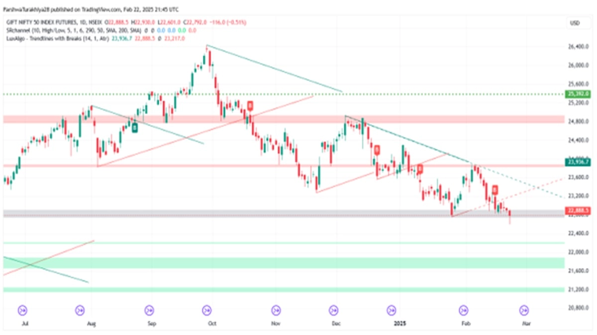 Gift Nifty 50 futures are exhibiting a downward trend, with price action respecting a descending channel. The market has been consistently making lower highs and lower lows, indicating persistent bearish sentiment.