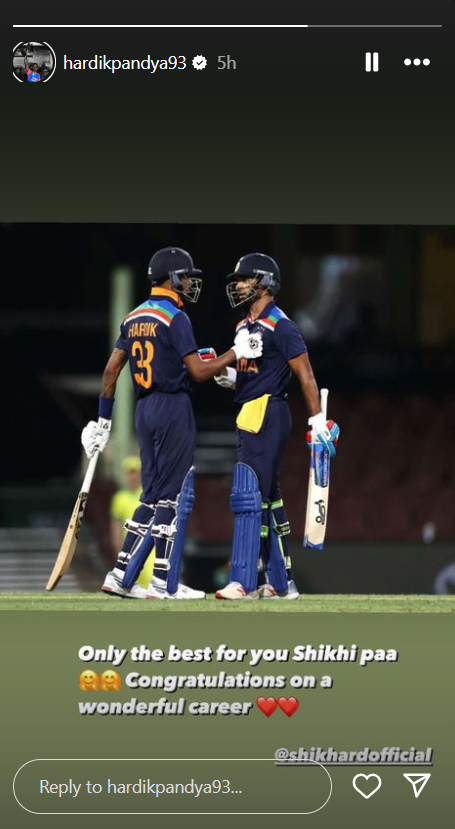 Congratulations on an outstanding career, shikhi pa. Itâs been a pleasure sharing the field with you. Best of luck for your new chapter.đâĽď¸@SDhawan25 pic.twitter.com/mqhCgR8N7K