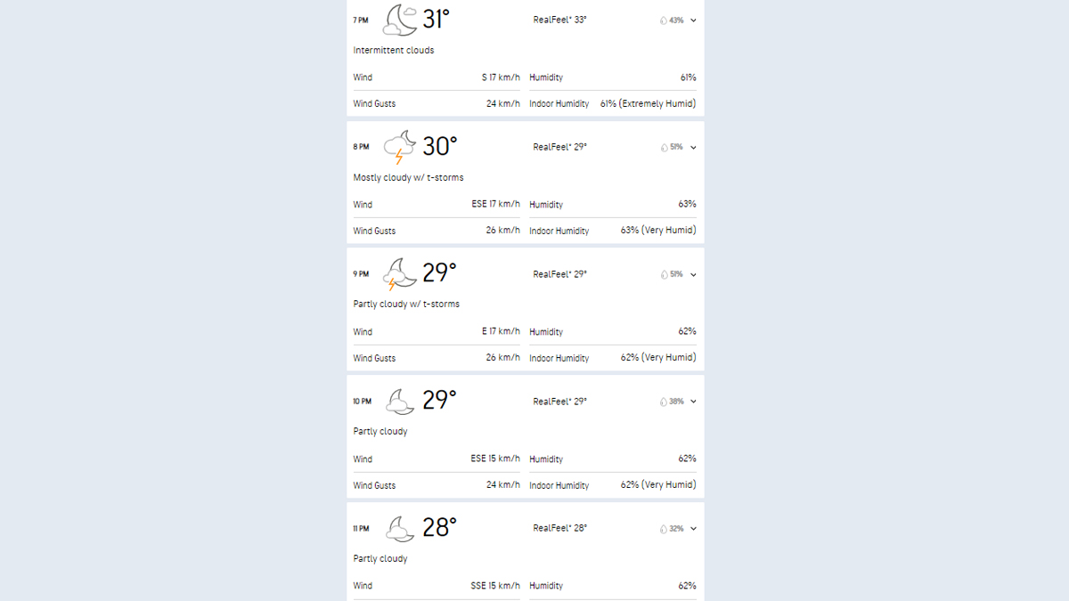 The weather during the SRH vs LSG IPL 2024 match will be cloudy and there are chances of thunderstorms during the game. There are 40-50 per cent chances of rainfall during the SRH vs LSG IPL 2024 game. The temperature will vary between 28-31 degrees Celcius.