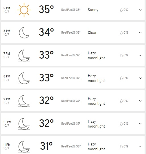 As the day proceeds, the mercury will drop down by a degree or so. By the end of the match, the weather will be around 32 degrees Celcius. There wouldn't be much of wind with 7 kmph predicted by Accuweather. The humidity will be placed at around 27 per cent. Dew will be around 13 degrees Celcius. Overall, there's no change in the weather conditions and are expected to remain as usual. Now, let's have a look at the snapshot of the weather below: