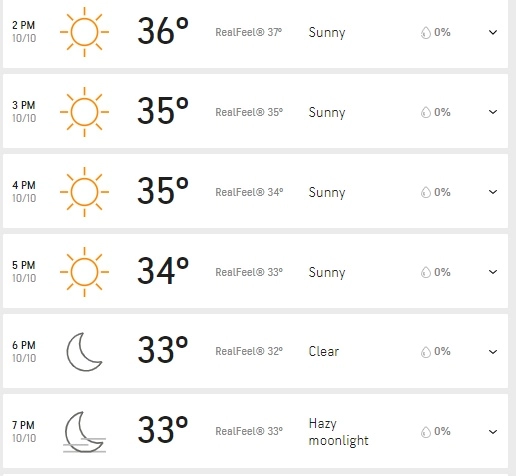 So since its an afternoon game, the weather will be really hot. The temperature would be ranging at around 35 degrees Celcius. There would be no drastic change in the weather as it will remain sunny throughout. No cloud cover which means the sun will be shining very brightly. However, by 4.00 pm local the temperature would drop by a degree or so. Now, let's have a look at the snapshot of the weather report below: