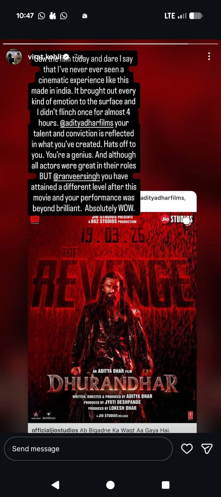 Kohli directed specific praise toward filmmaker Aditya Dhar, calling him a "genius" and stating that his "talent and conviction is reflected" in the creation. While he acknowledged that the entire cast performed well, he singled out Ranveer Singh for attaining a "different level" with a performance he described as "beyond brilliant". MI Captain Suryakumar Yadav Grooves To Dhurandharâs Hit Fa9la Song, Video Goes Viral.