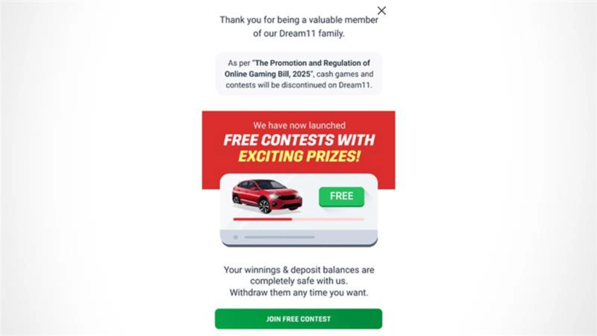 Well, now that there are no more paid contests on Dream11, what happens to the Dream11 wallet balance? Well, fans who have money deposited in their Dream11 wallet, need not worry at all. The Dream11 wallet balance is totally safe and can be withdrawn by fans at any time. Upon opening the Dream11 app, fans would get a pop-up on the screen that reads, "Thank you for being a valuable member of our Dream11 family. As per, "The Promotion and Regulation of Online Gaming Bill 2025", cash games and contests will be discontinued on Dream11. Your winnings and deposit balances are completely safe with us. Withdraw them any time you want." Additionally, it is also important to note that users can add any more money to their Dream11 wallets anymore after the introduction of the Online Gaming Bill.