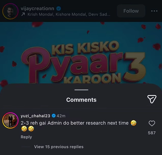 Instead of ignoring the parody, the leg-spinner leaned into the joke, winning over fans with his characteristically dry sense of humour. The posters, created by a digital artist using artificial intelligence, were titled Kis Kisko Pyaar Karoon 3, a nod to the 2015 comedy film starring Kapil Sharma about a man juggling three wives.
