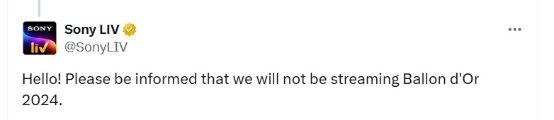 Sony Liv has been widely reported to be providing Ballon d'Or 2024 live streaming online in India. However, that is not the case as the streaming platform, in a post on 'X' confirmed that they won't be streaming the Ballon d'Or 2024 live in India.