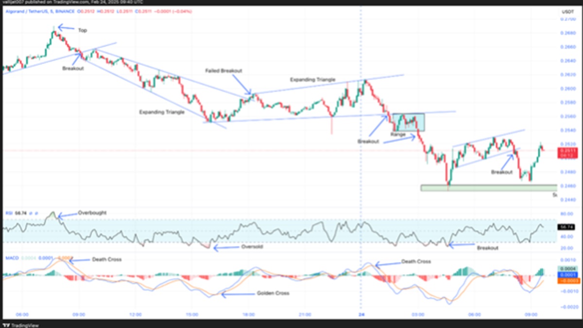 Algorand made a top of $0.2690 at 07:40 UTC on 23rd Feb after hitting the overbought level of RSI. The breakout at 09:05 UTC, corroborated by the Death Cross of MACD at 08:15 UTC, pushed the price lower in an expanding triangle pattern. The Golden Crossover of MACD at 16:25 UTC pushed the price up, and at 18:05 UTC, the price broke out to the upside of the expanding triangle. The breakout failed within four bars, and the price dropped back but was unable to break its lower low, forming another expanding triangle pattern.