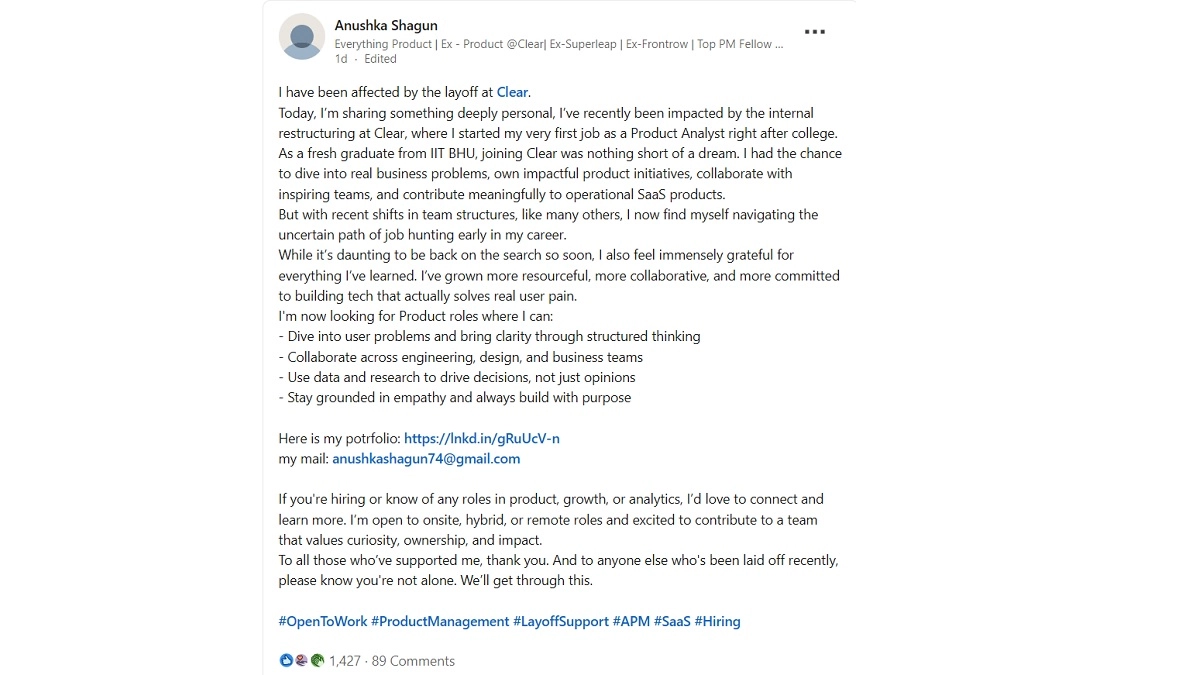 ClearTax Employee Anushka Shagun's LinkedIn Post After Layoffs