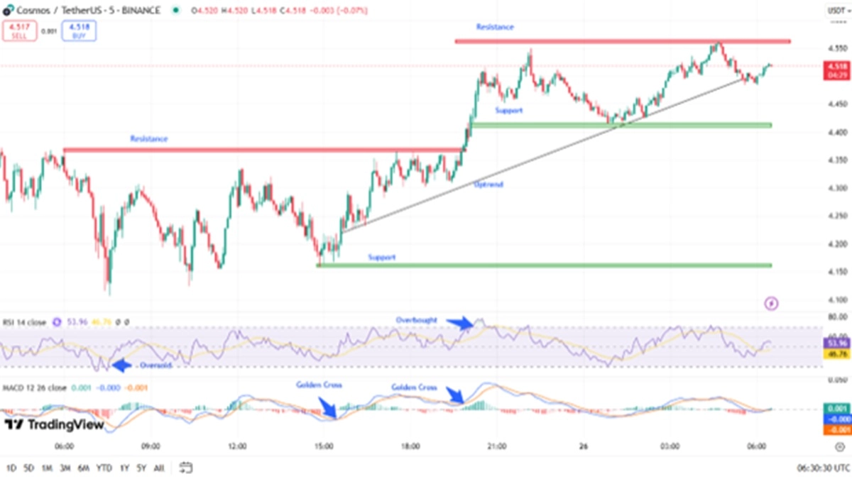Yesterday, on February 25, Cosmos (ATOM/USDT) showed strong bullish momentum, breaking past the $4.40 support and forming an uptrend with higher lows. A golden cross in the MACD earlier in the day, around 20:00 UTC on February 25, confirmed the trend shift thereby leading to a price surge toward $4.55 resistance. However, after reaching the overbought zone on the RSI, ATOM faced selling pressure,e causing a pullback toward the trendline support at $4.48 before stabilizing.