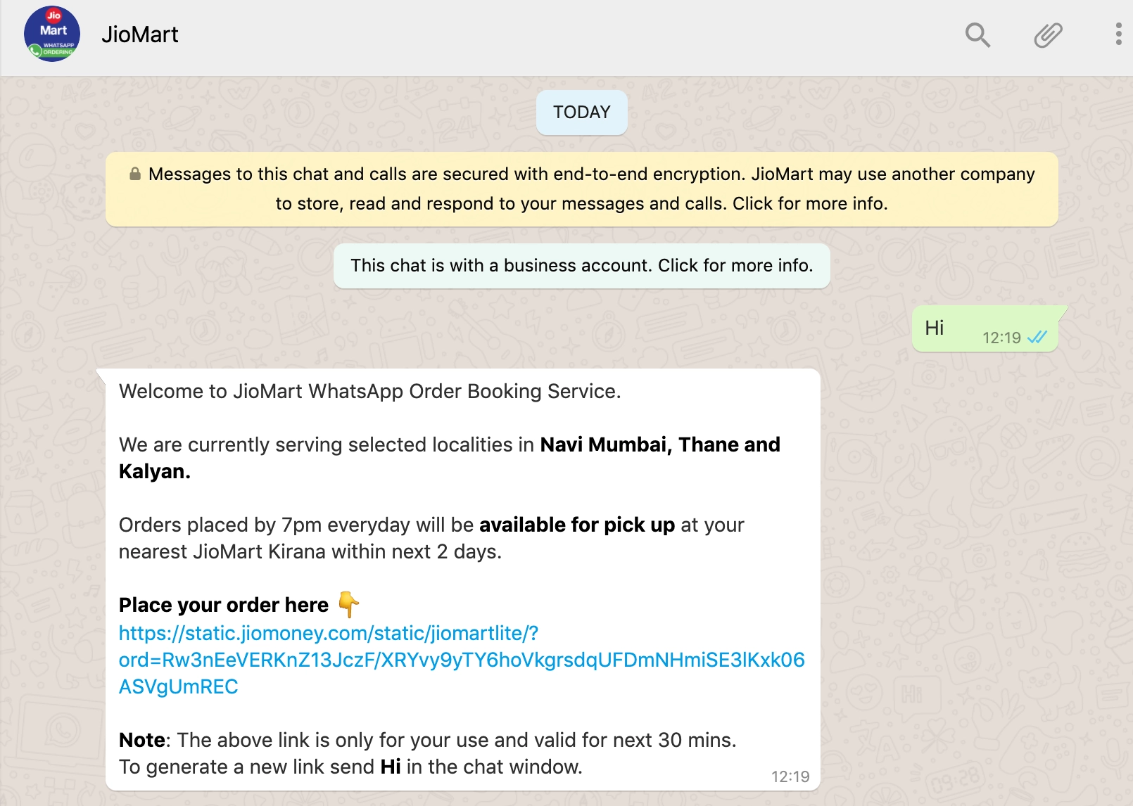 - Remember orders placed by 7 pm every day will be available for pick up at your nearest JioMart Kirana within next 2 days.