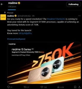 Depending on the processor, the smartphone may compete with Nothing Phone 2a, OnePlus Nord CE 4 and others, which offer around the same performance in terms of AnTuTu benchmarks. On the official website, Realme said that the device would also focus on charging and memory. The Realme 13 series will have the same design as the other mid-range series offered by the company.