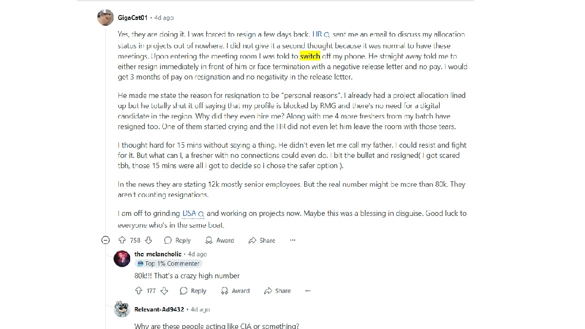 The Reddit user further said that he thought about saying something, but he could not do anything being a fresher with no connection. He got scared while resigning, and all he could do was decide. The fresher said, "He didn't even let me call my father." The Reddit user further claimed, "In the news, they are stating 12k, mostly senior employees. But the real number might be more than 80k. They aren't counting resignations."