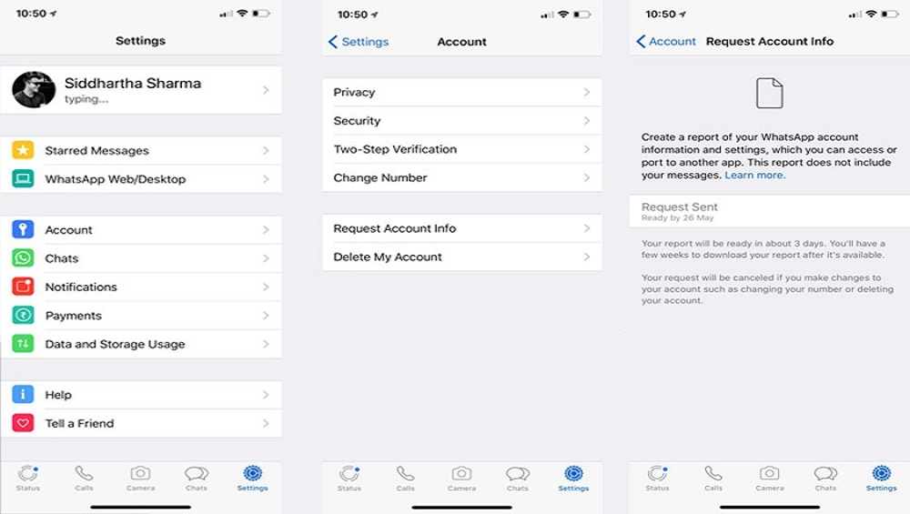 This feature allows users to create a report of their WhatsApp account information and settings, which can be accessed or ported to another app. This report doesn’t include personal messages. Once you open the report you will find your information such as your phone number, previous IP connection, device type, device manufacturer, profile picture, all your contacts’ numbers, groups names that you are part of and the contacts you have blocked.